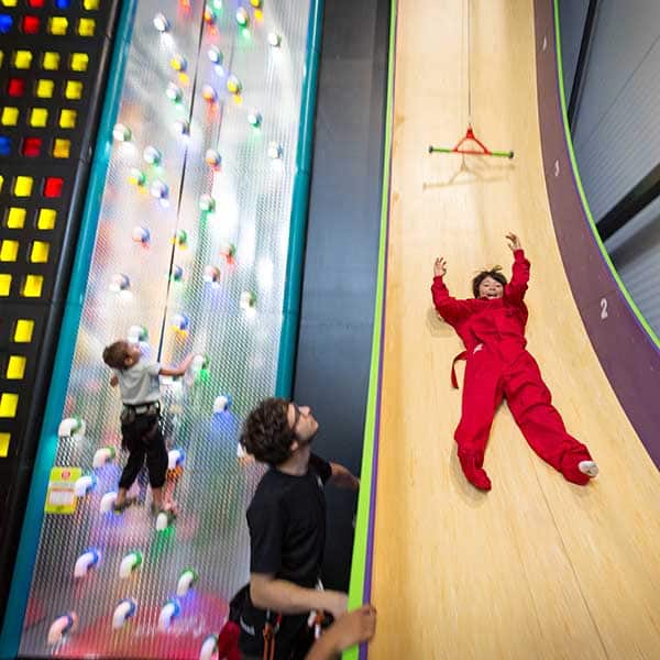 Grimpez sur des pans verticaux aux formes les plus délirantes ! Château fort, prises rotatives, tour de saut, toboggan géant…